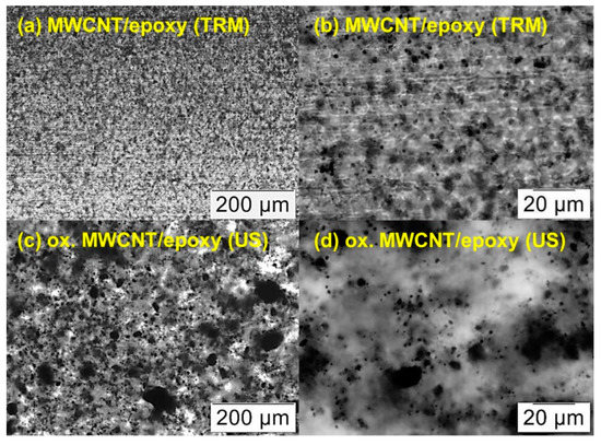 Light microscope images of section cuts of cured CNT/epoxy samples containing 0.7 wt% CNT related to the resin: (a,b) show neat MWCNT, dispersed in the resin with a three-roll mill (TRM) and mixed with the hardener by a mechanical stirrer. (c,d) show oxidized MWCNT, which were dispersed with ultrasonic (US) in the hardener first and mixed with the epoxy resin using a mechanical stirrer.