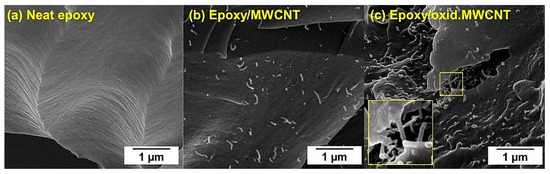 The results also underline the importance of surface functionalization of CNT for efficient improvement of mechanical properties of nanomodified composites. In case of ultrasonic dispersion of oxidized MWCNT in the hardener, covalent bonding between amine groups (-NH2) of the hardener and carboxylic groups (-COOH) can be assumed (amidation reaction) during the curing reaction. A connection of the second amine group of the bifunctional hardener molecule to the epoxy resin could establish a direct linkage, creating a network with much more efficient stress transfer from the cured composite to the CNT under mechanical load. Improved stress distribution is expected to be the underlying mechanism for the enhanced mechanical performance of the composites. Figure 10 shows SEM images of neat epoxy and MWCNT/epoxy nanocomposites after tensile failure. The fracture surface of unfilled resin (Figure 10a) is very smooth, whereas the addition of CNT increased the roughness and thereby the specific fracture energy. Individual MWCNT can be identified in Figure 10b,c. Several reinforcement mechanisms have been already reported extensively in the literature, including pull-out, fracture, and crack bridging of CNT [59,60]. Due to enhanced chemical affinity of oxidized MWCNT to the epoxy matrix, a stronger interfacial bonding was achieved, resulting in less CNT pull-out and more efficient crack bridging, which was observed in Figure 10c.