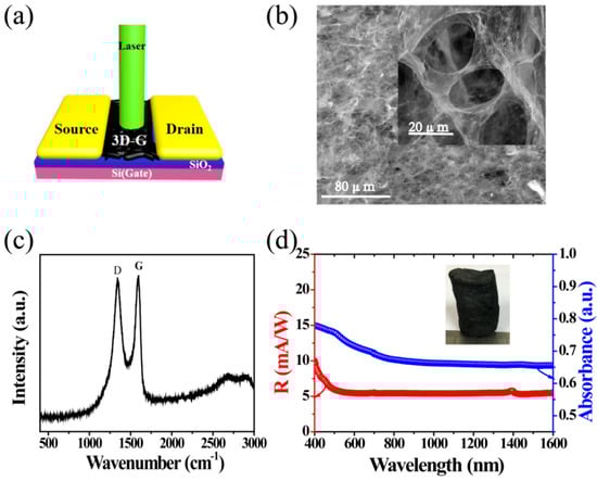 The architecture of the 3D rGOF phototransistor is fabricated with the configuration model shown in Figure 1a. The device includes a highly doped silicon wafer (Sin+) with a 300 nm thick gate layer, a SiO2 (capacitance Cox of 11.5 nFcm−2) gate dielectric layer, a 3D rGOF active layer and source and drain electrodes. In particular, the 3D rGOF was synthesized by hydrothermal reduction method, and the source and drain (Au-Au) electrodes were thermally evaporated through a shadow mask, with channel length L = 3 mm and channel width W = 2 mm, respectively. Figure 1b exhibits the surface scanning electron microscopy (SEM) image of the 3D rGOF device with a scale of 80 μm and the insert shows the surface morphology with a scale of 20 μm. The 3D rGOF shows across-linked and sponge-like structure with a pore diameter about 20 μm [27,29,30,31,32]. The typical Raman spectrum of the 3D rGOF is shown in Figure 1c. Two prominent characteristic peaks at ~1341 and 1592 cm−1 correspond to the graphene band D and G [29,33], and the absence of 2D peak means no layer accumulate. Figure 1d shows the photoresponsivity and absorption spectrum of the device at wavelength ranging from 400 to 1600 nm. The broadband absorption spectrum of 3D rGOF express a 65%–80% absorbance (which is affected by material defects) at least from 400 to 1600 nm wavelength indicating that this device can be used for broadband spectra detection. The wide absorption spectra are due to the unique structure of the zero-band gap between the valence band and conduction band of 3D rGOFs [25,34]. Moreover, the device exhibits a broadband photoresponse (400−1600 nm) with a maximum R of 10 mA/W and a minimum of 5.6 mA/W under 0 V source-drain voltage and 0 V gate voltage. Compared to the (single and few-layer) graphene photodetector with a maximum photoresponsivity of 0.5 mA/W reported by Fengnian Xia’s group, the 3D rGOF phototransistor revels about an order of magnitude improvement of the photoresponsivity [20]. The high responsivity can be related to the higher electrical conductivity, faster spatial separation and transportation of photogenerated charge carriers and higher absorbance, as compared with single and few-layers graphene. The insert is a photo of the columnar 3D rGOF.