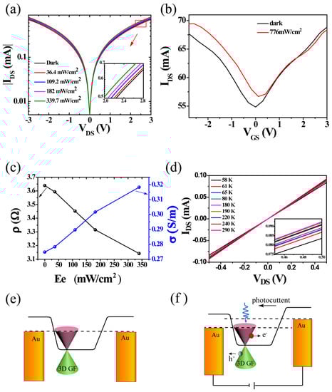 For electric measurements, IV characteristics and photoresponse current between the source (at ground) and drain electrodes of the 3D rGOF were tested. Figure 2a describes the IDSVDS characteristics as a function of the source–drain bias under dark and with (36.4, 109.2, 182, 339.7 mW/cm2) 532 nm light illumination at a fixed gate bias. As shown in Figure 2a, IDS increases with the increase of VDS. Moreover, the device displays a sensitive photoresponse under weak light irradiation and an increased photoresponse with light illumination intensity raised from low to high. The insert shows how the photo current varies with VDS from 2.0 V to 2.8 V. It is clearly seen that the photoresponse current increases with the increasing illumination intensity and under the same light irradiation the current increases with the increasing source-drain voltage. It can be understood that the photo induced carriers are enhanced by increasing bias voltage, which is ascribed to the increase of the electron and hole concentrations. The photocurrent generation is based on the separation of electron–hole (e–h) pairs 3D rGOF induced in 3D rGOF by external electric fields. The 3D rGOF phototransistor reveals a high photocurrent of 0.1 mA under 2.8 V bias voltage [19,20]. Figure 2b shows transfer characteristics of the 3D rGOF phototransistor with a bias voltage VDS = 0.3 V. In the transfer curves, the device exhibits a “V” shaped transfer curve and typically ambipolar characteristics reveal either electrons or holes transport in the n-type or p-type transport regions of the device, respectively [9,35]. As shown in Figure 2b, the curve shifts toward positive VGS with light illumination indicating a typical p-type doping [36], which means that electrons move from 3D rGOF to Au electrode owing to the difference of electron potentials and the holes tend to remain in the 3D rGOF. Figure 2c shows the resistivity(ρ) and conductivity(σ) of the device as a function of laser irradiance under 1.2 V bias voltage. It shows that with the laser irradiance increasing the resistivity decreases but the conductivity increases, which can be explained by the photoconductivity mechanism. With the increasing of the laser intensity, the free carriers increase leading to a decreased resistance to charge migration, which results in the decreased resistivity and increased conductivity. The potential variation and Fermi level mechanism for the photocurrent generation are shown schematically in Figure 2d. When light illuminates the 3D rGOF, electron–hole (e–h) pairs generate at the 3D rGOF interface between the electrodes and 3D rGOF. To exclude potential contributions from thermal effects, we measured the ISDVSD at temperatures from 58 to 290 K. Figure 2d shows the temperature dependent IV curves of the device between 58 and 290 K. As illustrated in the figure, the current increases with an increasing temperature from 58 to 180 K, and a slight decrease in the range 180–290 K. The temperature dependent IV curves of our device are consistent with the report results [37]. The small temperature dependence of ISDVSD allows us to exclude the temperature effect caused by laser illumination. Therefore, the photoresponse of our device is ascribed to a photoconduction mechanism. In Figure 2e,f, the solid line presents the Fermi energy of the two Au electrodes under light illumination. The e–h pairs become separate and a photocurrent is generated under the application of an external field. Usually, the recombination time of the e–h pairs is tens of picosecond, which is due to the quality and carrier concentration of the 3D rGOF [11,19,20]. Therefore, photocurrent generation is based on the separation of the e–h pairs under an external field. Moreover, in the 3D rGOF photodetectors, the honeycomb network in 3D rGOF allows for the almost unimpeded transmission of carriers through the potential barriers, leading to high-bandwidth photodetection.