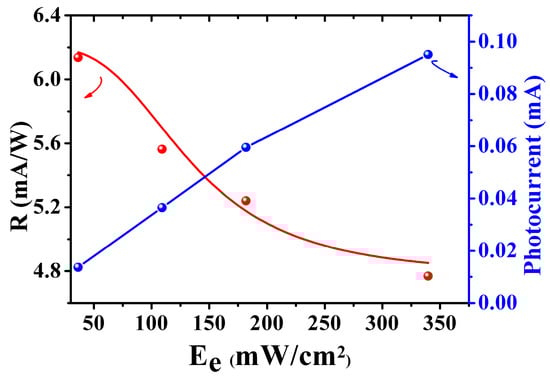 For the 3D rGOF photodetectors, photoresponsivity (R) is a key parameter [38,39,40]. Figure 3 displays the photoresponsivity (R) and photocurrent of the device at 532 nm as a function of laser irradiance Ee. It shows that the photocurrent increases with the increasing Ee and the maximum photoresponsivity (R) is 6.9 mA/W under 2.4 V bias voltage calculated by Equation (1).