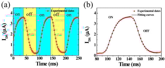 Figure 4. Photoresponse characteristics of 3D rGOF phototransistor with 532 nm laser under 50 mW/cm2 irradiation with VDS = 0.01 V, VGS = 0 V; (a) Current response cycles of the device (b) Time-dependent photocurrent responses during the rise and fall phases.