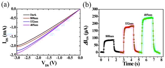 Figure 5. (a) IDSVDS output characteristics at the incident power of 26 mW under various illuminations of 405, 532, and 808 nm, with VGS = 3 V; (b) Photoresponse current at the incident power of 26 mW with various illuminations of 405, 532, and 808 nm under VDS = −1.5 V and VGS = 3 V.