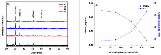 (a) The XRD intensities of as-deposited and as-annealed ITO films; (b) full-width at half-maximum (FWHM) and calculated average grain size of indium tin oxide (ITO) films as a function of annealing temperature in (222) crystallographic plane.