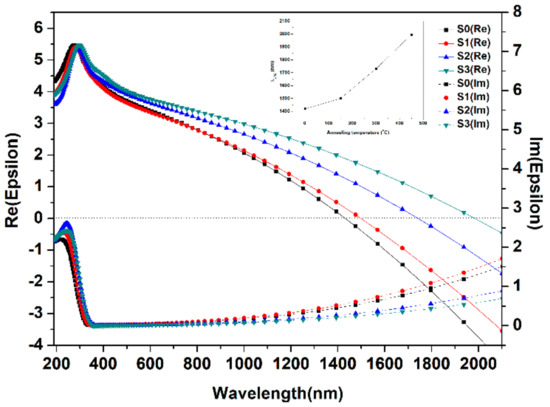 The optical permittivity ε(ω) of ITO films was investigated by spectroscopic ellipsometry method. Figure 3 expresses the measured permittivity which illustrates the influence of the annealing procedure on the real (ε) and imaginary (ε) parts of ε(ω). From Figure 3 and the inset figure, ITO films show an ENZ condition which is denoted by λENZ [52,53]. The λENZ of ITO films are 1422 nm (S0), 1504 nm (S1), 1730 nm (S2), and 1995 nm (S3), respectively. Accordingly, when the ENZ wavelength (λENZ) shifts to red and the imaginary permittivity reduces to less than 1 with increasing temperature. Furthermore, the real permittivity is nearly zero while the imaginary part is smaller than 1 which guarantees the internal fields enhancement that supports the ENZ condition in ITO films.