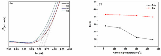Based on the formula above, while the annealing temperature rises, the bandgap Eg decreases due to the diminution of carrier concentration n. From Figure 4a it can be see that the optical absorption shows a red shift from 546 nm to 610 nm owing to the electron transition from the valence band to the defect energy levels, or from the defect to the conduction band [62,63,64]. Moreover, Figure 4c suggests the calculated ħωp and extrapolated Eg as a function of annealing temperature. With the increase of temperature, the values are decreasing, but the difference between them is more obvious. We calculate the absorption coefficient by Formula (4), catching an upward tendency which is consistent with Figure 4a. Finally, all of the variation is owing to the internal carrier fundamentally changes which root in the recombination of internal structure.