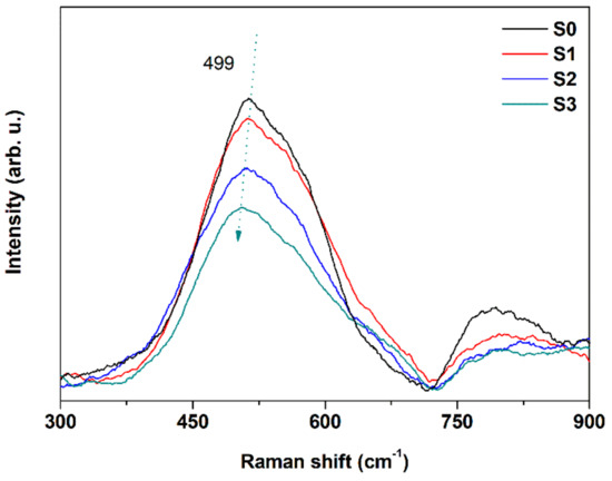 The oxygen vacancy defect states and stretching vibrational levels within ITO films were researched by Raman scattering. ITO has been proven to have 22 Raman responsive and 16 infrared responsive modes. The 499 cm−1 mode is rooted in the bending and stretching vibrations of InO6 octahedra. The oxygen vacancy defect has a great influence on the vibration of In–O–In bond, and it also causes the change of Raman scattering intensity and the shift of Raman peak position since the scattering intensity is proportional to the square of the derivative of the polarizability [56]. Here, we attribute the change of Raman spectra intensity to the reduction of oxygen vacancies and the rough surface. According to Figure 6, high frequency sets at 499 cm−1 are typically assigned to bcc (body-centered cubic)-In2O3 [65,66,67,68]. The blue-shift and the decreased intensity of 499 cm−1 peak demonstrate that there are fewer oxygen vacancies in ITO films after annealing according [65]. It indicates that oxygen vacancies are partially filled during the annealing procedure [69]. The broken of In–O–In bond also can be confirmed by the dissociated and agglomerated rough structure.