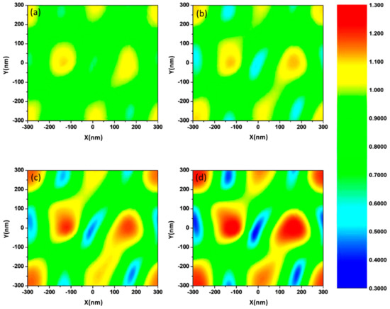 To further verify the absorption changes and the optoelectronic properties of the films, the electric field distribution on the rough surface was simulated by FDTD solutions. During the calculation, a 600-nm (consistent with the optical absorption peak wavelength) laser was irradiated perpendicular to the x-y plane of the ITO film and polarized along the y-axis. The values of different parameters including optical refractive index and RMS applied in the model are consistent with the experiment data. According to Figure 7a, the electric field is well-distributed and the enhancement effect is not significant due to the smooth surface. With the temperature increasing, the electric field intensity enhances and the density of free electrons begins to appear maldistributed. This result is consistent with the reduction of free carrier concentration owing to the increase of internal structure defects and the decrease of oxygen vacancies. The surface “hot spots” (as shown in Figure 7b–d) verify the enhancement of absorption. The defects in the ITO thin film enhanced the localized surface electric field and visible absorption intensity. The simulation results fit well with the experimental evidence.