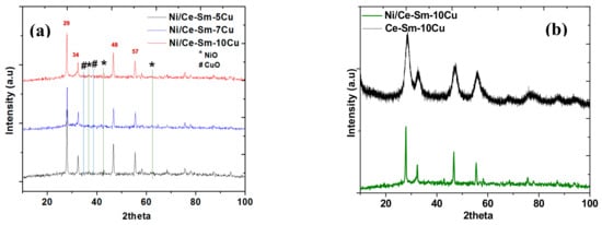 X-ray diffraction (XRD) patterns of the: (a) Ni/Ce-Sm-xCu (x = 5, 7, and 10 at.%) catalysts; (b) Ni/Ce-Sm-10Cu catalyst and Ce-Sm-10Cu support.