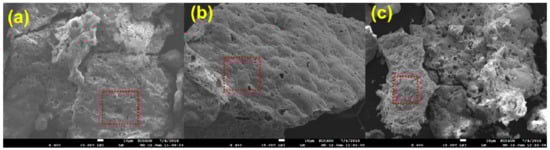 Scanning electron microscopy images of the Ni/Ce-Sm-xCu catalysts: (a) 5% Cu; (b) 7% Cu; (c) 10% Cu.