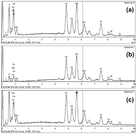 EDX spectra of the Ni/Ce-Sm-xCu catalysts: (a) 5% Cu; (b) 7% Cu; (c) 10% Cu.