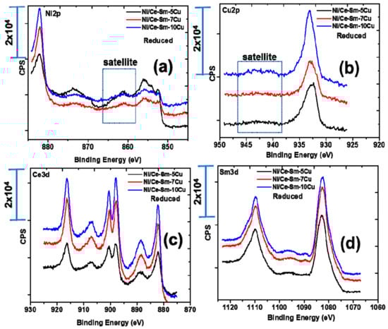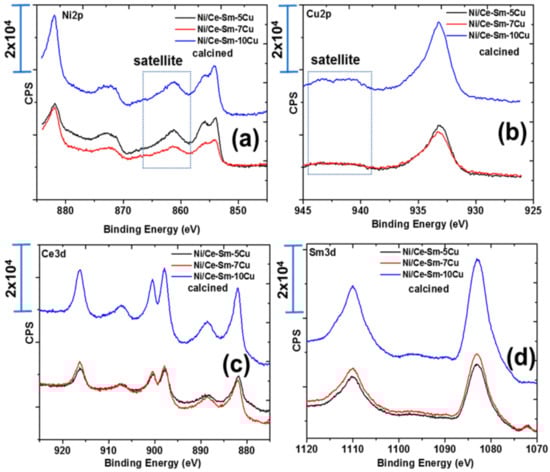 Figure 5 and Figure 6 present the core level spectra of Ni2p (a), Cu2p (b), Ce (c) and Sm3d (d), respectively, following calcination at 800 °C for 4 h (Figure 5) and reduction at 800 °C for 1 h (Figure 6), respectively. For the calcined catalysts, the following remarks can be made regarding the oxidation states of the elements: The Ni2p profile is composed of a peak at ~854 eV which corresponds to Ni2+ species of the bulk NiO phase and a peak at ~856 eV accompanied by a satellite peak at 861.48 eV, which designates the presence of Ni2+ species in strong interaction with the support [60], most likely with Cu2+ species [61]. This finding corroborates the coexistence of at least two Ni2+ species on the surface of the calcined catalysts. Based on the Cu2p3/2 core level spectra, the peak at 933 eV escorted by a satellite peak in the 940–945 eV coincides with the presence of Cu2+ oxidation state on the surface of the catalysts, in agreement with the XRD and Raman results. Based on the Ce3d core level spectra, it can be stated that most of Ce is in Ce4+ oxidation state with minor Ce3+. The Sm 3d peak at 1082.5 eV corresponds to the Sm3+ oxidation state as anticipated. Following reduction of the catalysts, the presence of Ni0 was confirmed based on the XPS peak at 852 eV (Figure 5a). The binding energy of Cu species is shifted to slightly lower values of 932.78 eV compared to 933.28 eV in the case of the calcined Ni/Ce-Sm-5Cu catalyst (Table 2) and this can be linked with the change of the electronic density of the atoms.