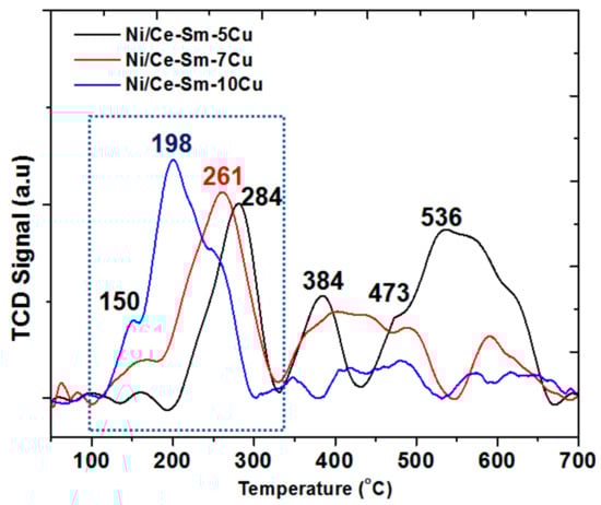 - The low temperature reduction peak at 150 °C can be linked to the reduction of amorphous CuO, in weak interaction with the support, whereas in the 150–200 °C range, the reduction of CuO in strong interaction with the support and the partial reduction of surface CeO2 at the metal support interface takes place [53,65,66]. The peak above 200 °C can be assigned to highly dispersed NiO [53,65,66]. Among the catalysts presented in Figure 7, the Ni/Ce-Sm-5Cu has the highest reduction temperature (284 °C) compared to the Ni-Ce-Sm-7Cu (261 °C) and Ni-Ce-Sm-10Cu (198 °C) and this can be due to the Cu-rich character of this catalyst (Ni/Cu = 0.37) corroborating for some incorporation of the Ni into the ceria fluorite structure, and thus, suppressing its reduction. However, such an Ni incorporation is expected to diminish the sintering likelihood for this catalyst.