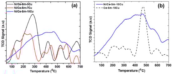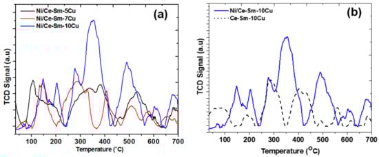 - It has been reported by Lin et al. [67] that the TPR of the CuNi bimetallic catalysts had five TPR peaks, demonstrating the complexity of the reduction process. It was also suggested that the presence of metallic Cu enhanced the reduction of the Ni. This effect might be due to the competitive growth of the two oxide phases (NiO, CuO) that leads to a reduction in their crystallite size. It is worthwhile to recall here that in Figure 1 (XRD data) only traces of NiO and CuO phases were found. In agreement with Lin et al. [67], easiest reduction took place in the case of Ni/Ce-Sm-10Cu.