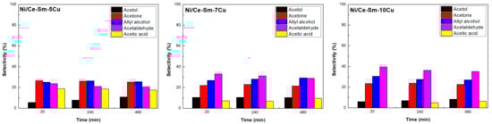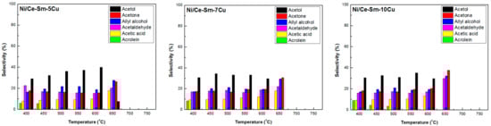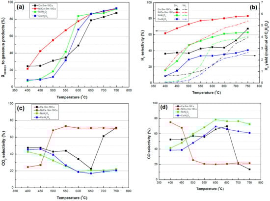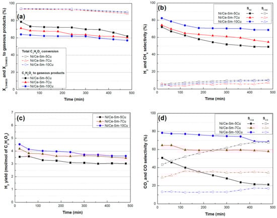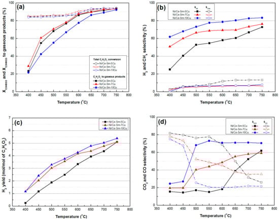 The influence of reaction temperature on hydrogen and methane selectivity (SH2 and SCH4, respectively) is shown in Figure 10b. With regards to SH2, it follows the trend Ni/Ce-Sm-10Cu > Ni/Ce-Sm-7Cu > Ni/Ce-Sm-5Cu, i.e., the higher the Cu content, the more selective towards H2 the catalysts appears to be. The same is also true for hydrogen yield, YH2 (Figure 10c) with values equal to 5.4 (Ni/Ce-Sm-10Cu), 5.1 (Ni/Ce-Sm-7Cu) and 5.0 (Ce-Sm-5Cu), at 750 °C. In terms of SCH4, the Ni/Ce-Sm-7Cu and Ni/Ce-Sm-10Cu samples exhibit low, stable values for the entire temperature range (Figure 10b). In contrast, for the Ni/Ce-Sm-5Cu catalyst, these values increase with temperature from ≈3% at 400 °C to 13% at 750 °C
