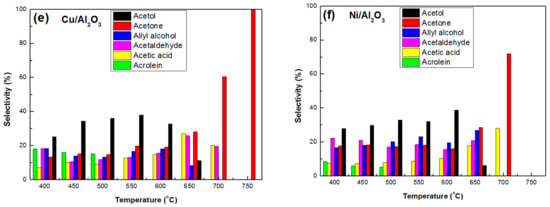 Catalytic performance is reported in terms of H2 yield, H2, CO, CH4 and CO2 selectivity, glycerol conversion into gaseous products, and total glycerol conversion. Moreover, the performance of the catalysts for the liquid phase products is reported in terms of acetol (C3H6O2), acetone [(CH3)2CO], allyl alcohol (CH2=CHCH2OH), acetaldehyde (C2H4O), acetic acid (C2H4O) and acrolein (C3H4O) selectivity. Performance parameters were calculated based on Equations (4)–(9):