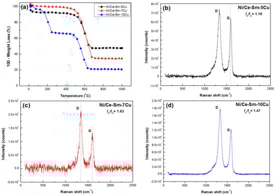The amount of carbon deposited on the catalysts was measured with a thermogravimetric analyzer (TGA), on a Leco TGA701 instrument (LECO Corporation, St. Joseph, MI, USA). The thermal decomposition process of the coke formed onto the spent catalysts was also obtained. In the procedure, ≈50 mg of the spent catalyst was subjected to a TGA scan from room temperature (RT) to 1000 °C at a heating rate of 10 °C min−1 under a flow of dry air (3.5 L min−1). Curie point standards were utilized for the temperature calibration.