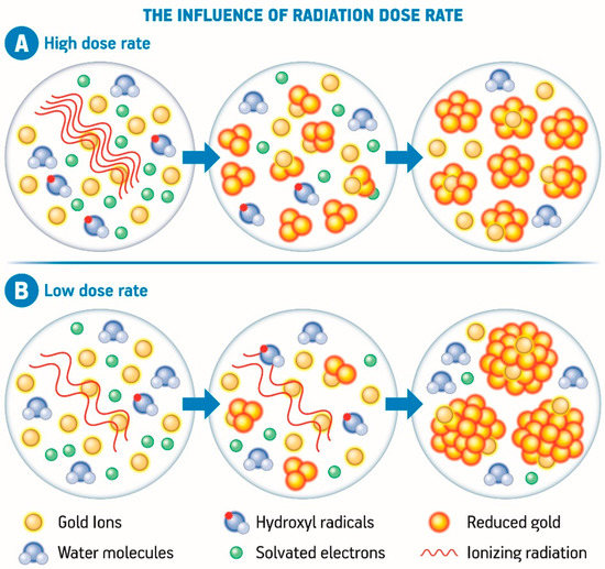 Representative scheme of the influence of high dose rate (A) and low dose rate (B) over the nucleation and growth of gold nanoparticles generated by the radiolytic synthesis using high energy radiation (Adapted from [108,109]).