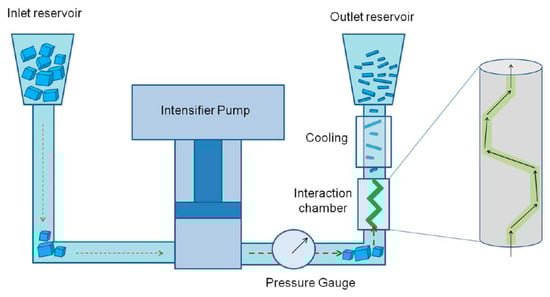 Schematic of the microfluidization process. An intensifier pump applies high pressure (up to ~207 MPa) and forces the suspension to pass through the microchannel of the interaction chamber where intense γ 108 s−1 is generated. The processed material is cooled and collected from the outlet reservoir. The process can be repeated several times. Reproduced from [23]. Copyright American Chemical Society, 2017.