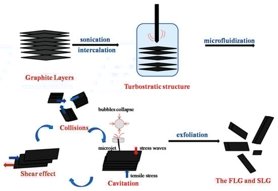 As for the exfoliation mechanism during the microfluidization, there are three effects on the exfoliation of graphite—cavitation, shear stress, and collision (Figure 11) [60]. The dispersion of graphite was forced into the chamber channel, and the shear force controlled exfoliation. The collisions caused by micro jets could produce shear forces, in which monolayer or few-layer graphene could be self-peeled down owing to the lateral self-lubrication ability. The function of cavitation is similar to the sonication assisted LPE.