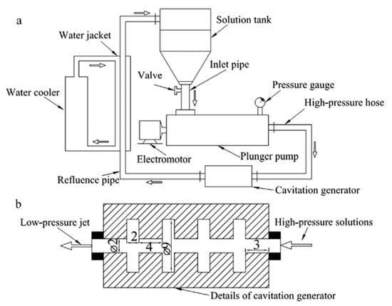 (a) Schematic of the designed jet cavitation device. (b) Details of the cavitation generator (mark unit: mm). Reproduced from [22]. Copyright IOP Publishing, 2011.