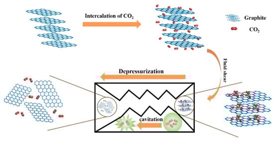 The mechanism drawing of exfoliation graphene nanosheets with supercritical CO2 and micro-jet exfoliation. Reproduced from [73]. Copyright IOP Publishing, 2017.
