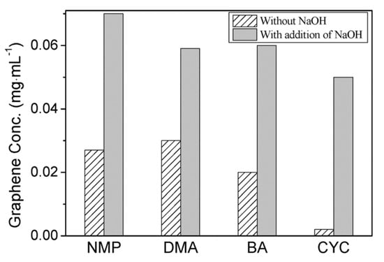 Concentrations of graphene sheets dispersed in organic solvents with or without addition of NaOH. Reproduced from [46]. Copyright Royal Society of Chemistry, 2011.
