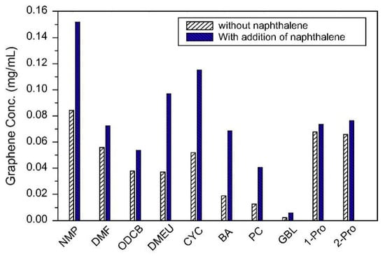 Concentrations of graphene sheets dispersed in organic solvents with or without addition of naphthalene. Reproduced from [84]. Copyright Elsevier, 2014.