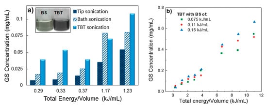 Optimization of sonication procedure, dispersant and energy/volume. (a) GS concentrations upon bath sonication (BS), tip sonication (TS) and tip-bath-tip sonication (TBT). Inset: image of the supernatant of the GS dispersions after centrifugation; (b) concentration of graphene sheets (with TX-100) as a function of integrated sonication energy/volume. These solutions were treated by TBT cycles. Reproduced from [50]. Copyright Owner Societies, 2013.