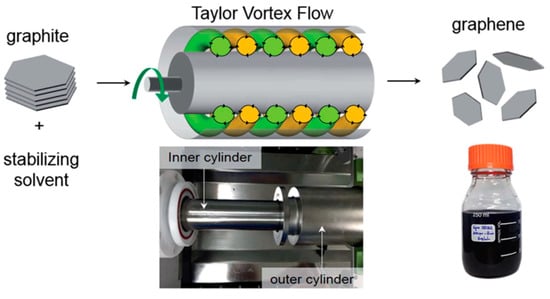 - Tran, T.S.; Park, S.J.; Yoo, S.S.; Lee, T.; Kim, T. High shear-induced exfoliation of graphite into high quality graphene by Taylor-Couette flow. RSC Adv. 2016, 6, 12003–12008. [Google Scholar] [CrossRef]
