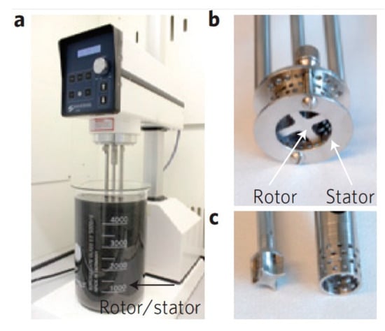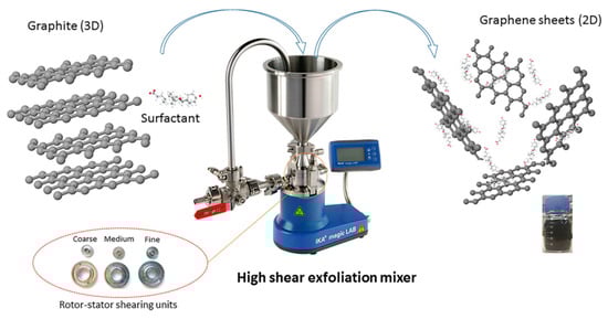 It has been shown that graphene can be exfoliated in the suitable liquid under shear force [25]. Moreover, the application of high shear forces through the use of high-shear mixers have been investigated as scalable methods of graphite exfoliation [19]. Shear exfoliation is similar to sonication exfoliation as aqueous liquids can be used to facilitate the exfoliation of graphite and provide stable dispersions of graphene thereby eliminating the use of harmful organic liquids.