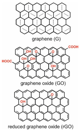 Structures of graphene (G), graphene oxide (GO), and reduced graphene oxide (rGO). According to the adaptive natural density partitioning analysis and the electron sharing indices, graphene is aromatic, but its aromaticity is different from the aromaticity in benzene. Aromaticity in graphene is local with two π-electrons located over every hexagon ring [8].