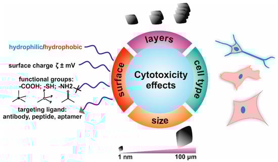 The aforementioned results emphasize the important role of the surface physicochemical characteristics of graphene and graphene-based materials in their interactions with biomolecules and cells (Figure 3). In particular, the role of their surface chemistry, size, and ability to adsorb active biomolecules has a huge impact on their cytotoxic effects and should be presented in all manuscripts concerning the use of such materials for biomedical applications [71,80].
