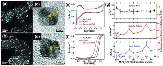 In order to obtain alloyed NPs, a one-pot synthesis method is generally adopted, that is, controlling the reaction conditions of the mixture of the reactant, the solvent, and the additive, during which different metals are simultaneously reduced [62,63]. Through simply adjusting the molar ratio of Pt and another metal, the binary composition of the resulted alloyed NPs is well controlled. Zhang et al. reported a one-pot strategy to prepare the highly uniform Pd–Pt alloyed NPs with various Pt/Pd atomic ratios supported on graphite nanoplatelets by simply adjusting the molar ratio of the Pd/Pt precursors [64]. As the Pd content increases, the X-ray photoelectron spectrum (XPS) shows that the Pt 4f binding energy gradually decreases, which is due to partial transfer of electrons that is induced by the electronegativity difference between Pt and Pd. The Pd1Pt3 NPs exhibited the highest activity towards MOR compared with pure Pt NPs and Pd-Pt bimetallic NPs with other atomic ratios, which indicates that a reasonable composition regulation is beneficial to the catalytic effect. Besides the component ratio, the type of additive metal element in a multi-component NP is also proved to be a key factor to modulate the properties of Pt-based NPs. Huang et al. doped Pt3Ni octahedrons with M, where M is vanadium, chromium, manganese, iron, cobalt, molybdenum, tungsten, or rhenium [65]. Among them, molybdenum doped Pt3Ni (denoted as Mo-Pt3Ni) NPs showed the highest catalytic activity towards oxygen reduction reaction (ORR), and its area and mass specific activity were 81 and 73 times higher than those of commercial Pt/C catalyst, respectively, as shown in Figure 2.