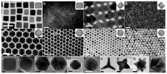 Pt NPs with different shapes: (a,b,i) cubes, (c,d,j) octahedrons, (e,f,k,l) icosahedrons, (g) cuboctahedrons, (h,n) spheres, (m) truncated cube, (o) tetrapod, (p) star-like octapod, (q) multipod, (r) 5-fold twinned decahedron. Scale bars: (a,e,g,h) 20 nm, (b,d,f) 50 nm, (c,o,p,q) 10 nm, 100 nm, (i,j) 2 nm, (k,l,m,n,r) 5 nm. Reproduced from [79], with permission from American Chemical Society, 2013.