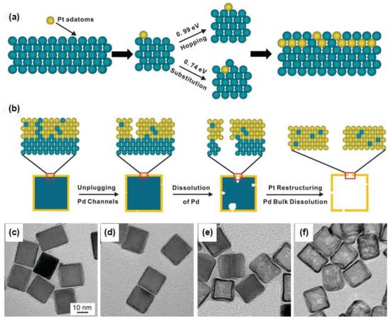 Scheme illustration of Pt-based nanocages with subnanometer-thick walls: (a) Pt atoms deposited on the Pd surface may diffuse (“hop”) across the surface or substitute into the surface, leading to a mixed outer-layer composition. (b) Schematic of the major steps involved in the continuous dissolution of Pd atoms from a Pd@Pt4L cube to generate a Pt cubic nanocage. (c–f) TEM images of Pd@Pt4L cubes after Pd etching for (c) 0, (d) 10, (e) 30, and (f) 180 min. Adapted from [96], with permission from AAAS, 2015.