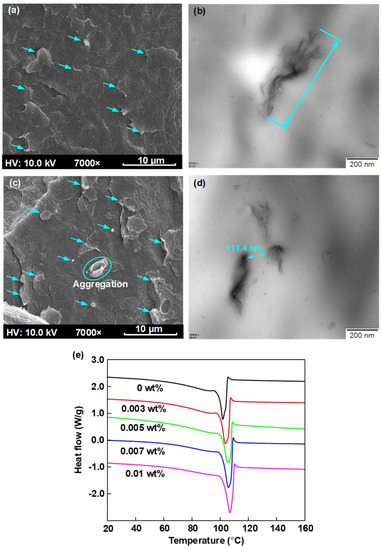 (a,b) SEM and TEM images of the cross section of the 0.005 wt % graphene/LDPE Nanocomposites. (c,d) SEM and TEM images of the freezing microtome section of the 0.01 wt % graphene/LDPE Nanocomposites (e) DSC curves of Nanocomposites as a function of graphene content.