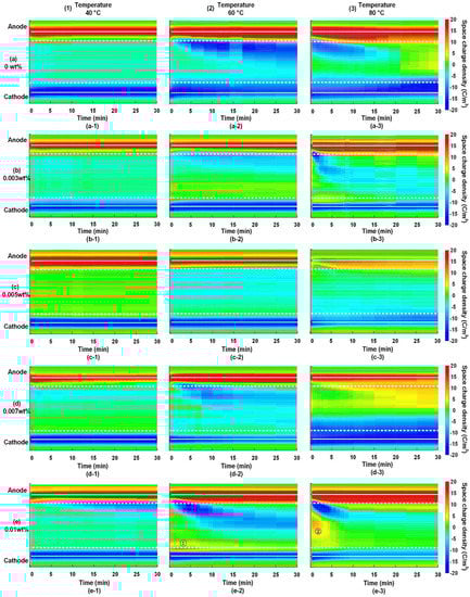 It is obvious that both the ambient temperature and graphene addition had a marked effect on the injection and accumulation of space charge. For the 0, 0.003, 0.005 and 0.007 wt % samples at temperature of 40 °C shown in Figure 3(a-1)–(d-1), most space charges were accumulated in vicinity of both electrodes and few space charges were injected into the bulk. Therefore, both the polarity and the amount of space charge remained stable under applied voltage. It is indicated that the space charge injection and transportation was inactive under 30 kV/mm at 40 °C. With the rise of the ambient temperature from 40 to 80 °C, an obvious aggravation of space charge injection and accumulation occurred in the neat LDPE. As shown in Figure 3(a-2)–(a-3), both the polarity and the amount of space charge vary with the polarization time.