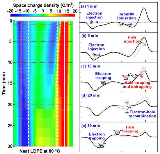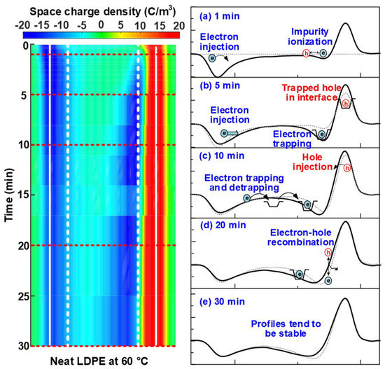 For the neat LDPE at 60 °C shown in Figure 4, an evident injection of electrons from the cathode occurred at a polarization time of 1 min. Meanwhile, heterocharges were observed at the vicinity of the anode, which was considered to be resulting from the space charge injection and impurity ionization. With the lapse of polarization time, numbers of electrons injected from cathode were transported towards anode and trapped, giving rise to the accumulation of heterocharges at the side of the anode. Besides, negative charges generated by impurity ionization were trapped and accumulated near the anode. As a result, the electric field nearby anode was enhanced severely, which would reduce the potential barrier for Schottky injection and further lead to an injection of holes from the anode after the electric field was applied for 10 min, as shown in Figure 4b,c. Consequently, recombination processes between electrons and holes occurred at some recombination sites in the vicinity of anode, and homocharges become dominate at the position nearby the anode marked with the white dashed line, as shown in Figure 4. The profiles of space charge tended to be relatively stable up to 30 min. This phenomenon was exactly similar to the results reported by [8], in which the space charge polarity in the vicinity of anode reversed with the temperature rising from 30 to 50 °C for XLPE under 30 kV/mm. The results indicated that the rise of ambient temperature from 40 to 60 °C had a significant effect on the charge injection and accumulation in neat LDPE samples, especially for electrons.