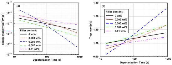 The average charge densities (q(t)) in LDPE samples during the depolarization process of 15 min were calculated by Equation (2) and presented in Figure 7, and the carrier mobility and the corresponding trap energy of graphene/LDPE nanocomposites at 60 °C are shown in Figure 8. It can be observed in Figure 7 that the average charge density within neat LDPE sample exceeded 5 C/m3 at 5 s, and decayed with time nonlinearly. The decay rate of charge density declined with time, due to the deeper traps involved in the depolarization process. It was also observed that the 0.003, 0.005 and 0.007 wt % graphene/LDPE nanocomposites all had much lower initial charge densities and slower charge decay rates than that of neat LDPE. As shown in Figure 7, the order of residual charge density up to 15 min of depolarization time is 0 wt % > 0.007 wt % > 0.003 wt % > 0.01 wt % > 0.005 wt %.