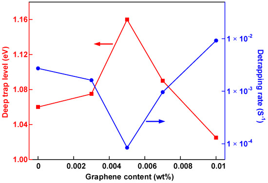 where d is the number of defect movement directions. h is the Planck’s constant. ν is the vibration frequency around the defects at the orthogonal plane flaw of moving direction. The νATE can be considered as a constant that is equal to 2.85 × 1013 s−1 at 60 °C (333.15 K) [28]. The trap depth of each sample at 300 s in Figure 8b was set as the deep trap level. The deep trap level of graphene/LDPE nanocomposites as well as the de-trapping rate (Pde) at 60 °C are presented in Figure 9. It is indicated that, with the increase of the filler content from 0 to 0.005 wt %, the deep trap level increased from 1.06 to 1.16 eV, following with the decrease of the de-trapping rate from 2.7 × 10−3 to 8.4 × 10−5 s−1. The lower the de-trapping rate in dielectrics, the more difficult the charge injection and transport. With a further increase of graphene from 0.005 to 0.01 wt %, the local overlapping between the interface regions or even the agglomeration (shown in Figure 2) lead to a decrease of deep trap level and a higher de-trapping rate, resulting in an aggravation of space charge injection and transportation.