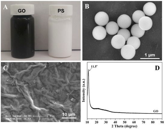 Figure 1. (A) Digital photo of GO and PS solutions, SEM images of (B) PS colloidal particles and (C) GO film, and (D) XRD pattern of GO.