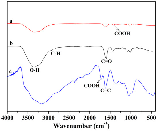 Figure 2. FT-IR spectra of (a) mp-CA/GO, (b) CA and (c) GO.