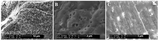 Figure 3. SEM photos of (A,B) mp-CA/GO/CA and (C) CA.