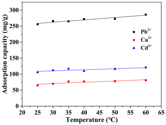 Furthermore, the effect of environmental temperature on the adsorption behavior for heavy metal ions was also investigated. As seen in Figure 6, the adsorption capacity of the mp-CA/GO increased slowly with the increase in temperature. However, its improvement in terms of adsorption performance was vague, possibly because the large specific surface area and controlled porous structure of mp-CA/GO allowed the metal ions to acquire additional binding sites and rapid ion diffusion rate on the material. The adsorbent’s weak sensitivity to temperature is crucial to practical applications, thereby enabling the mp-CA/GO to be potentially applied to the practical treatment of heavy metal ions.
