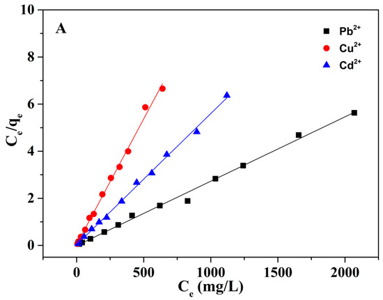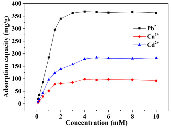 The maximum adsorption capacity is one of the most important features for the adsorbent. As seen in Figure 7, the adsorption capacity increases dramatically with the initial concentration from 0.1 mM to four mM for the mp-CA/GO. After exceeding four mM, the increment in mp-CA/GO has leveled off, possibly because of the lack of adequate functional groups to accommodate additional metal ions. The maximum adsorption capacities of mp-CA/GO for Pb2+, Cu2+, and Cd2+ are 368.2, 98.1 and 183.6 mg/g, respectively. These values are higher than most of the reported heavy metal ion adsorbents [25,26,27,28,29,30,31,32,33,34,35,36,37,38,39,40,41,42,43] (Table 2).