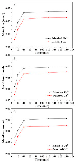 Figure 9. The mole amount of (A) Pb2+, Ca2+, (B) Cu2+, Ca2+ and (C) Cd2+, Ca2+ in different adsorption times.