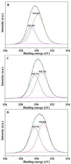 Figure 10. O1s XPS spectra of (A) mp-CA/GO, (B) mp-CA/GO with Pb2+ adsorption, (C) mp-CA/GO with Cu2+ adsorption, and (D) mp-CA/GO with Cd2+ adsorption.