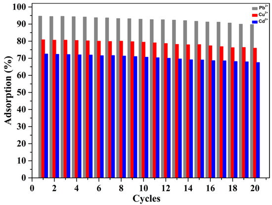 The recyclability of mp-CA/GO is depicted in Figure 11. The mp-CA/GO could remove Pb2+, Cu2+ and Cd2+ after 20 adsorption-desorption cycles with a performance loss within five %, possibly attributed to the GO, as reinforcing fillers, to maintain the mechanical strength and elasticity of mp-CA/GO during the continuous adsorption-desorption process.