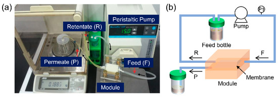 (a) Photographic image and (b) schematic drawing of the cross-flow filtration system used in this study.
